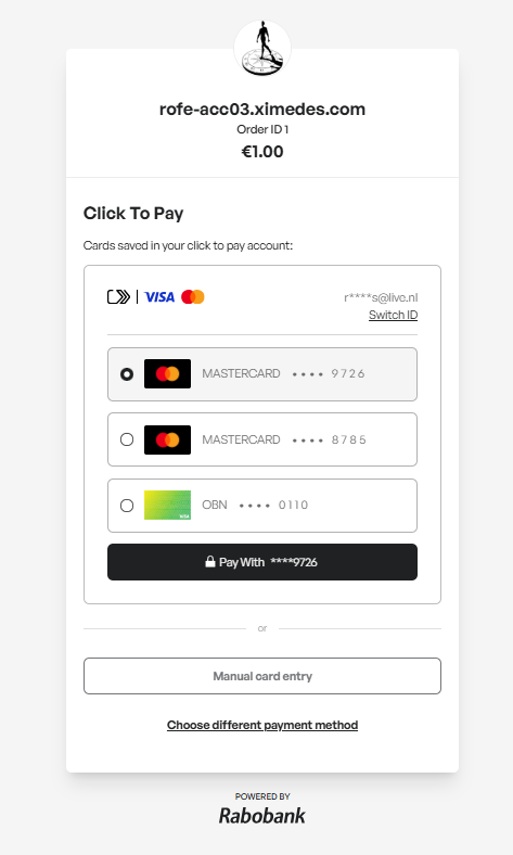 No additional integration or development effort is required. If an order is announced via the API and Click to Pay is enabled for the webshop, the shopper will automatically be presented with the Click to Pay option in the Rabo Smart Pay hosted checkout page.